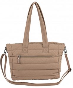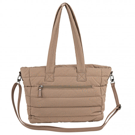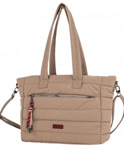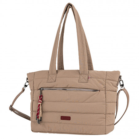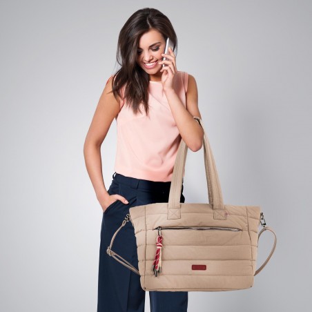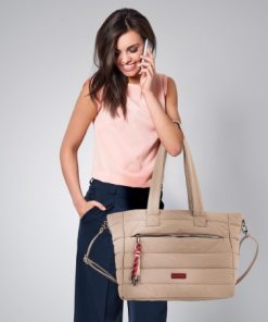 bolso beige acolchada con bastantes bolsillos y muy liviana