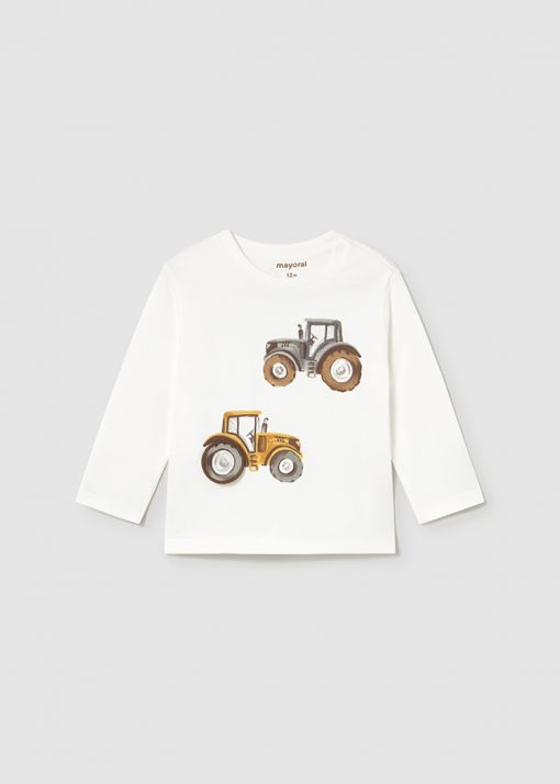 camiseta color nata con tractor y ventana con perrito