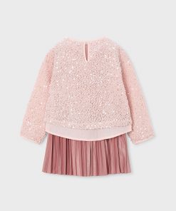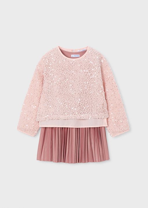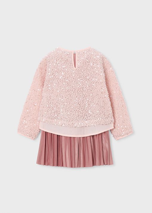 vestido asillas con falda plisada y jersey lentejuelas todo en color maquillaje
