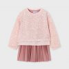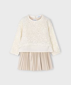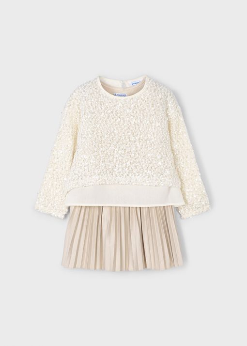vestido asillas con falda plisada y jersey lentejuelas todo en color beige-oro