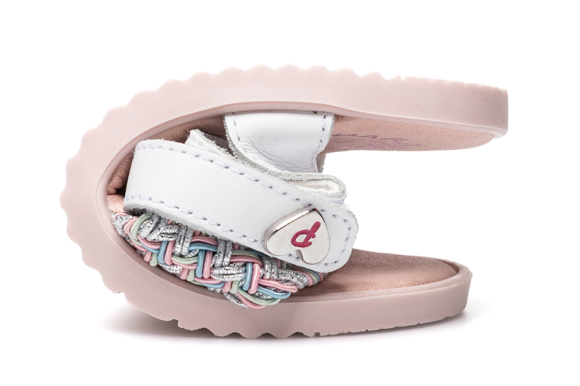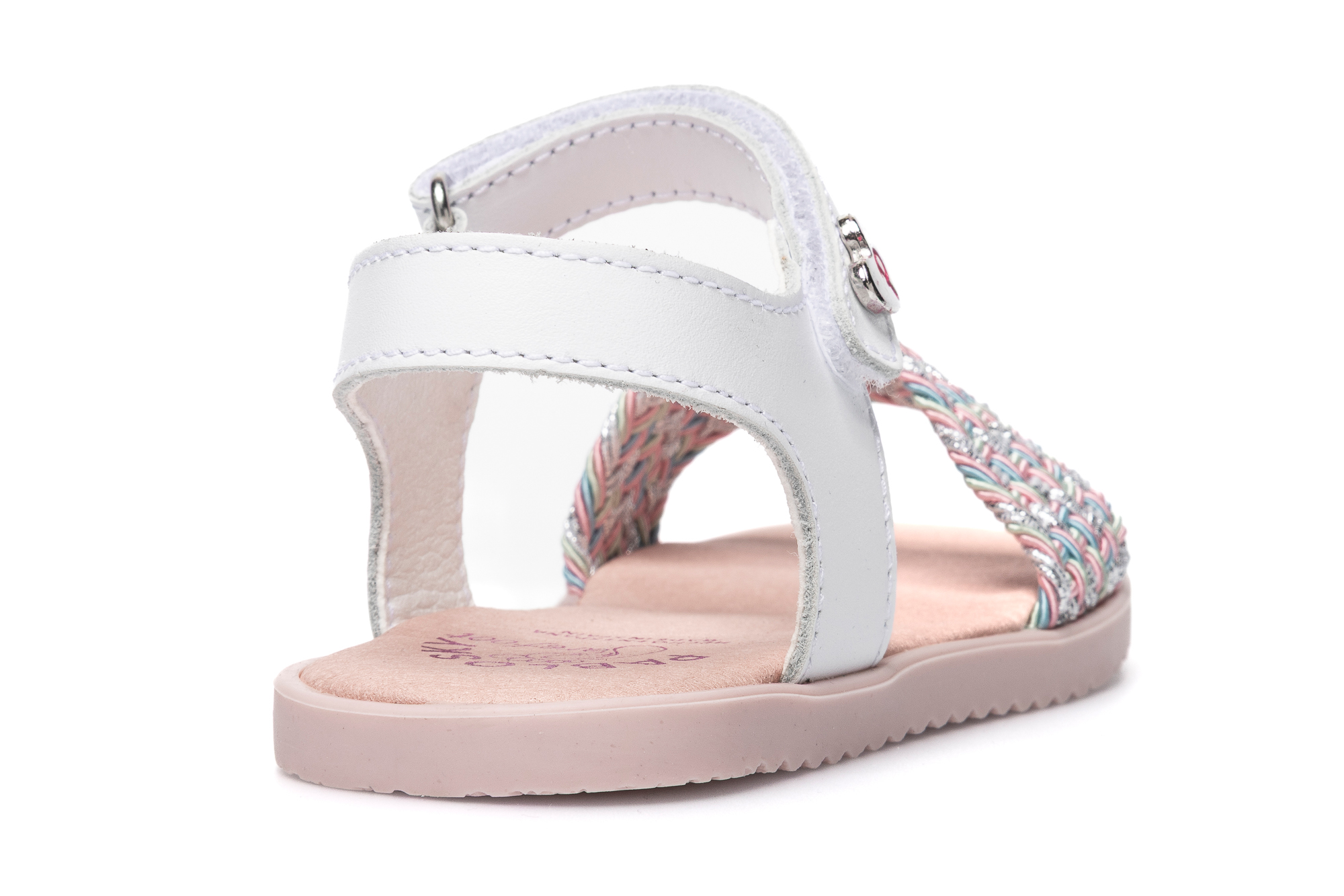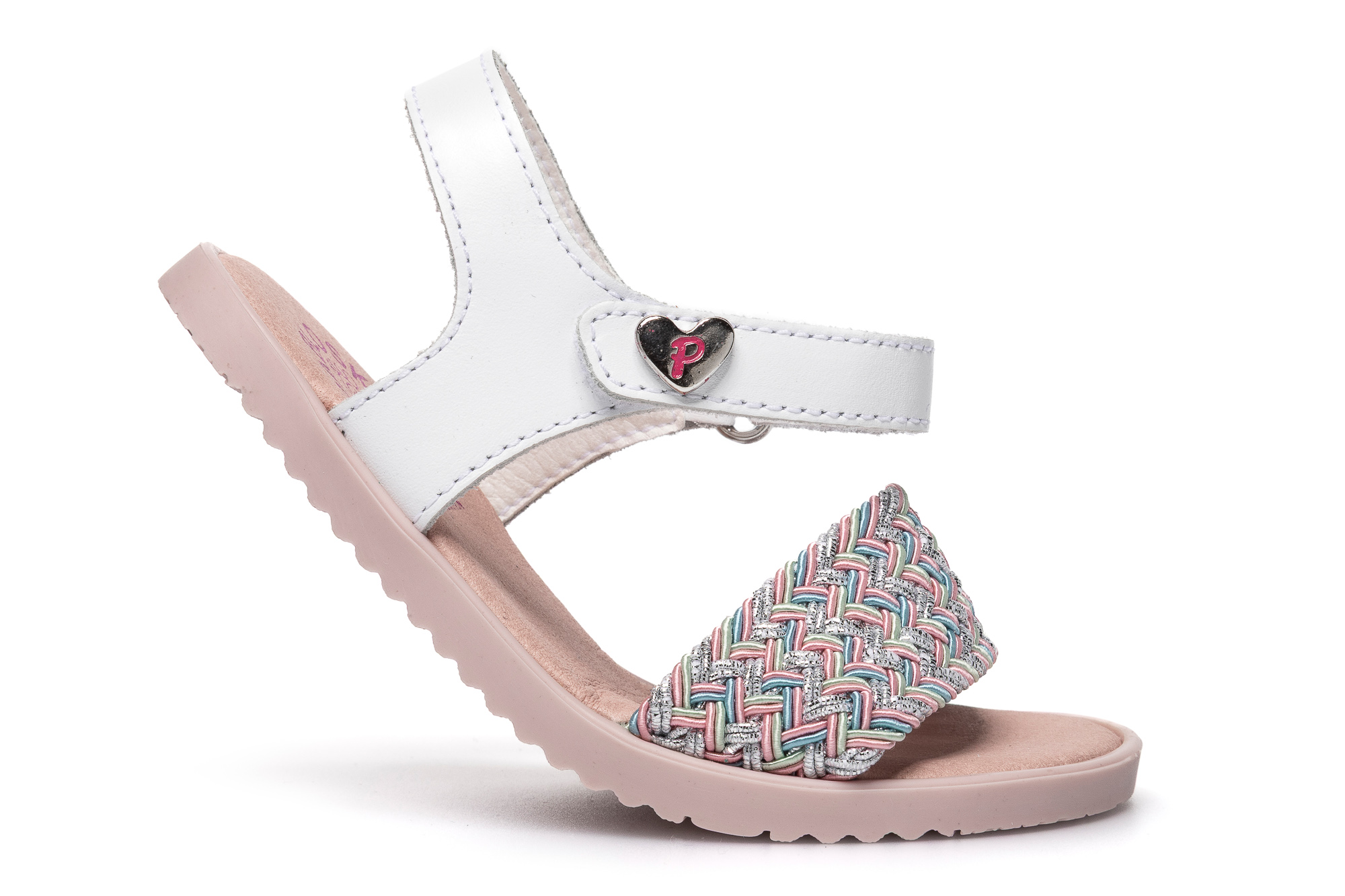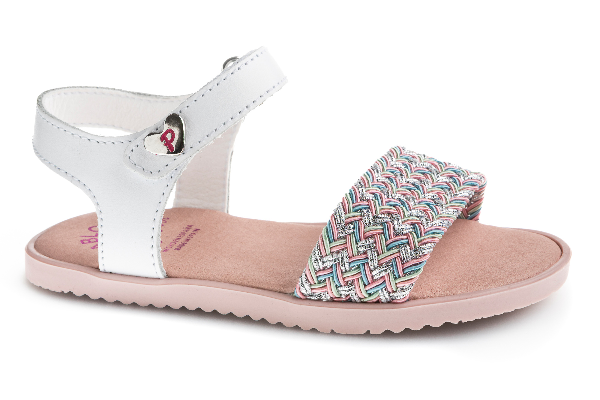 sandalia piel trenzado color plata blanco azul