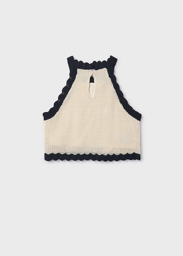 top hilo color hueso-negro de tirantes con flores sobrepuestas