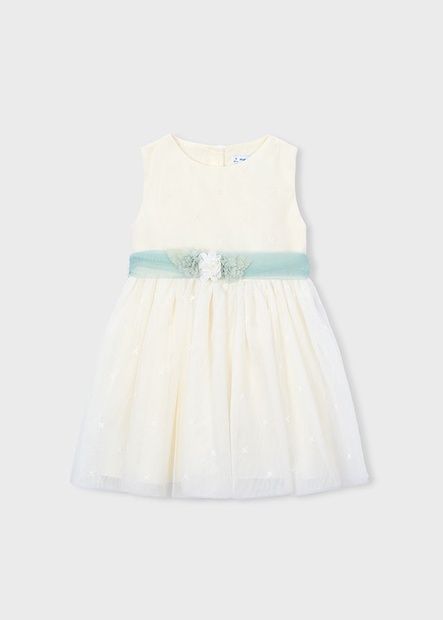 vestido ceremonia color crudo con lazada en verde menta con flor y falda bordada al tono