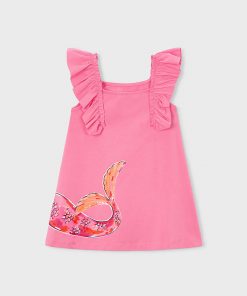 vestido color geranio con diseño lentejuelas mangas volantes